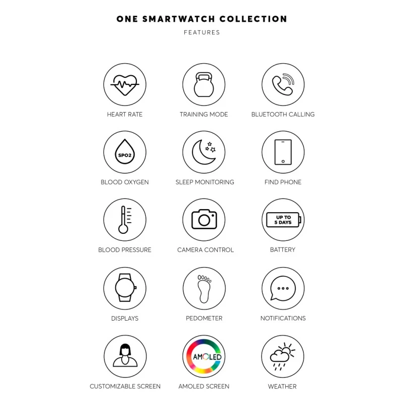 | Funções | Alarme, Ritmo Cardíaco, Treino, Notificações, Oxigénio no sangue, Sono, Pedómetro, Medidor de Tensão, Controlo da Câmara, Múltiplos Ecrãs, Bateria até 5 dias, Ecrã Personalizável com Fotografia, Faz e Recebe Chamadas por Bluetooth, Encontrar Telefone, Tempo, Calculadora, Cuidados Femininos, Always-on, Assistente de Voz, Calendário, Lanterna , Ecrã Amoled, Coroa Rotativa, |