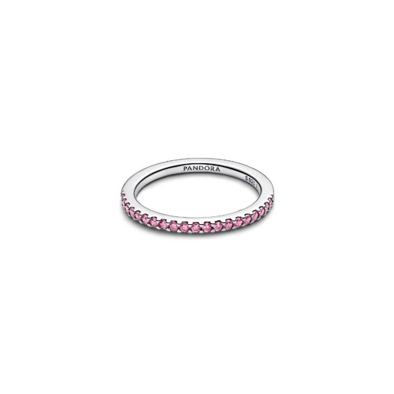 Escolha um brilho delicado com este anel pandora em prata de lei 925 que exibe uma fila de cristais cor de rosa em pavé, que iluminam a metade dianteira do aro de perfil quadrado. Uma peça elegante e versátil, perfeita para adicionar um toque de sofisticação ao seu estilo.