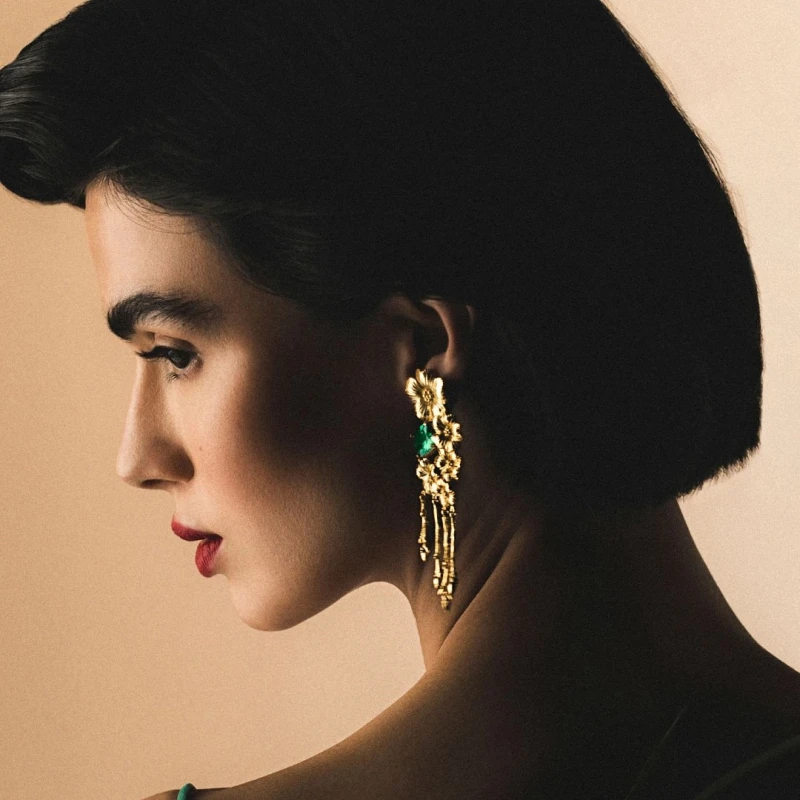 Brincos Amália x Portugal Jewels para mulher em prata de lei 925 com um banho dourado para um visual brilhante. Com o seu design detalhado de um conjunto de flores que sustentam pequenos ramos em fase de florescimento, uma zircónia retangular com uma vibrante coloração em verde é envolvida pelos elementos florais causando uma harmonia que captura uma ligação emotiva à vida. Com um toque clássico, este par de acessórios são desenvolvidos em colaboração com a Fundação Amália Rodrigues, retratando uma inspiração na icónica cantora de fado e uma beleza única ao visual de uma mulher.