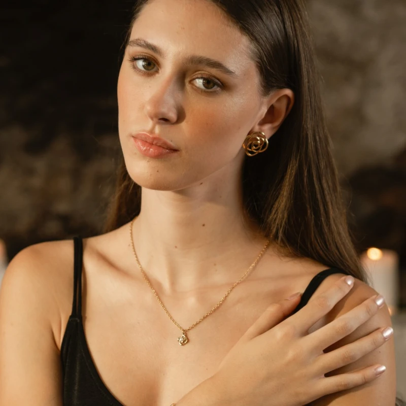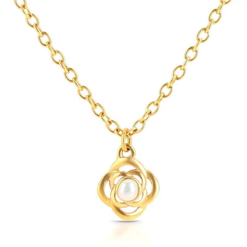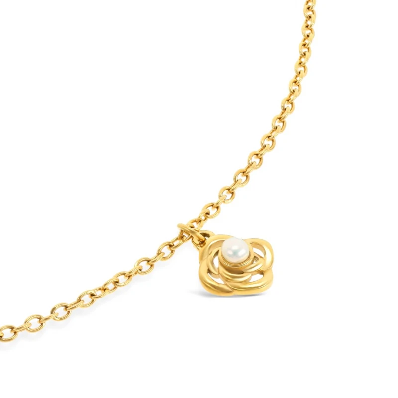 Este colar é uma peça delicada que une um design mais clássico a elementos mais contemporâneos. O colar é composto por uma malha dourada de pequenos elos redondos e por um discreto pendente. O pendente do colar, também em dourado, tem a forma mais minimalista de uma rosa vista de cima com uma pequena pérola cravada na parte central.
