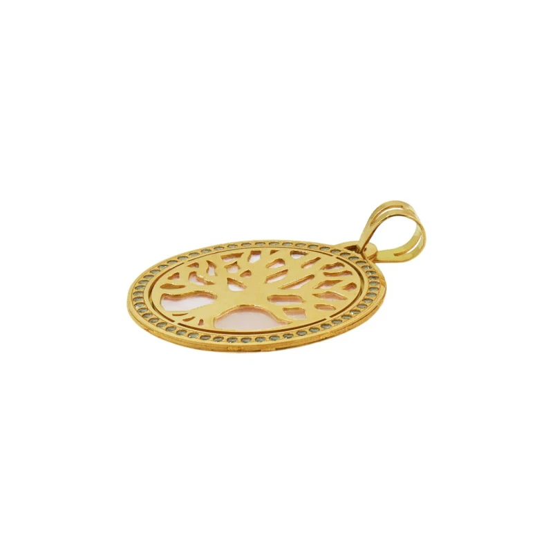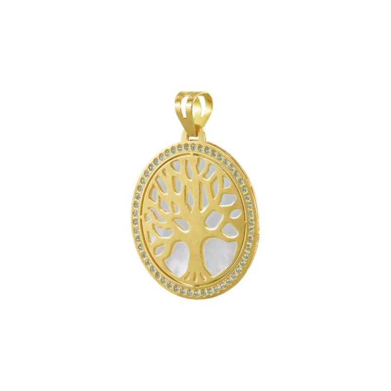Encantador medalha em ouro dourado de 19.2kl com cravação de pedras zircónias, uma joia envolvida em simbolismos com a sua representação da árvore da vida como elemento figurativo de criação e eternidade. Detalhada com uma camada de uma pedra semi-preciosa em Madrepérola envolta por trás do elemento da natureza, desperte um toque de brilho delicado e num design cintilante e elegante.