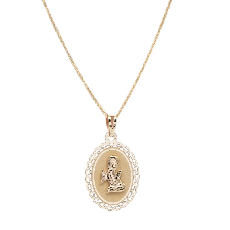 Delicada medalha em ouro de 9kts (375) da Zerus Jewellery. Com uma base oval em pendente, o centro da joia retrata uma elegante figura angelical em relevo com traços e detalhes minuciosos, despertando uma harmonia com o visual envolvente. Uma representação que alia o estilo clássico ao moderno que captura um brilho refinado que se eterniza em ocasiões especiais.