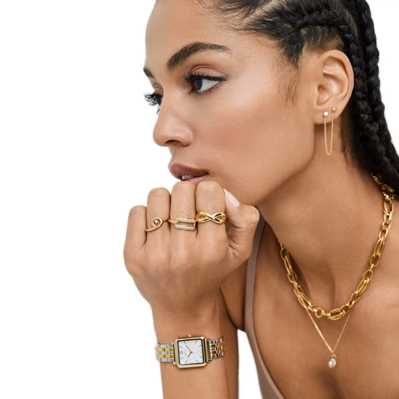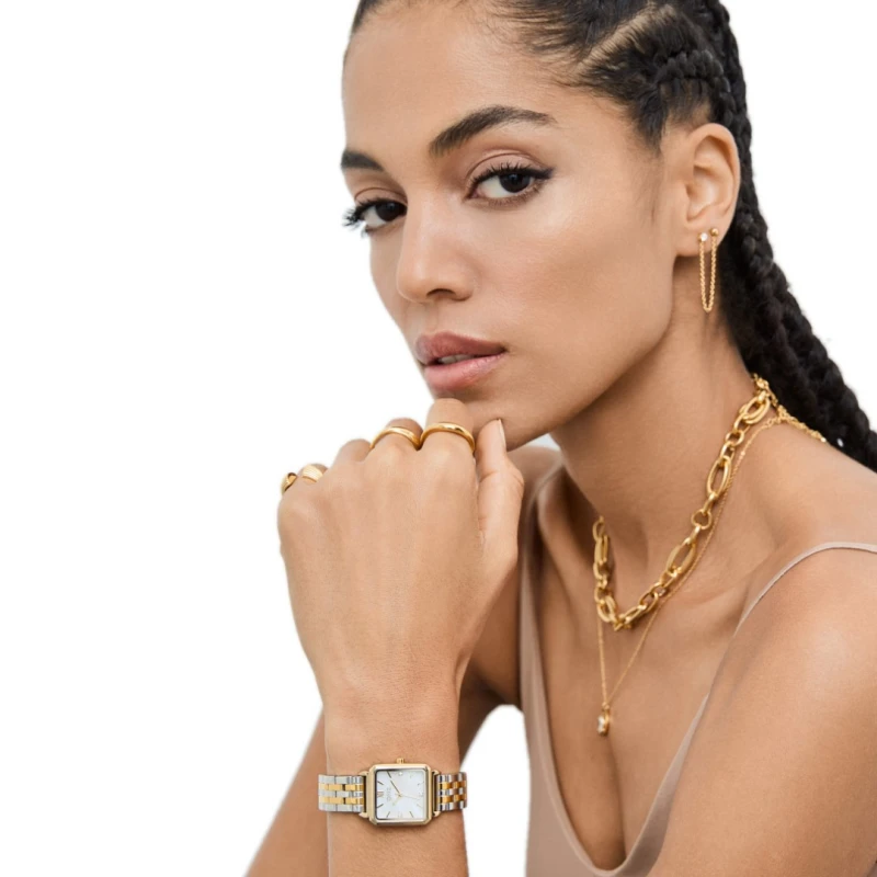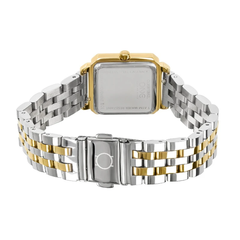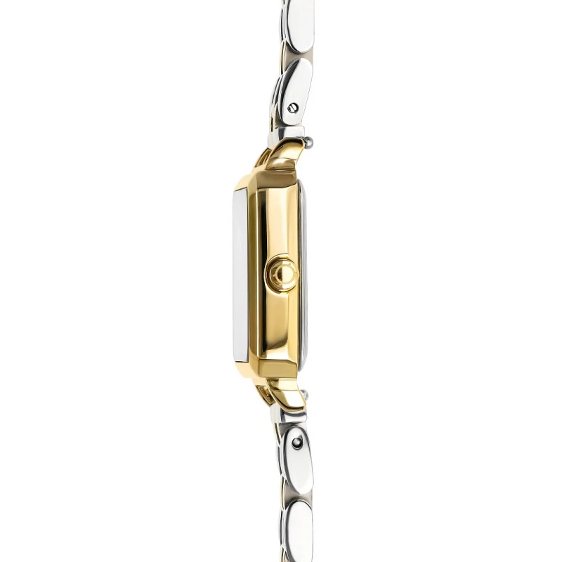 Relógios One de mulher da linha Rêverie, um acessório elaborado em aço que exala beleza com uma paleta bicolorida, em prateado e dourado, que se contrasta habilmente com o brilho opalescente de uma pedra semi-preciosa em madrepérola, aplicado no mostrador quadrangular. De design clássico aliado a elementos modernos que se complementam, acrescentando ao visual um toque sofisticado e versátil.
