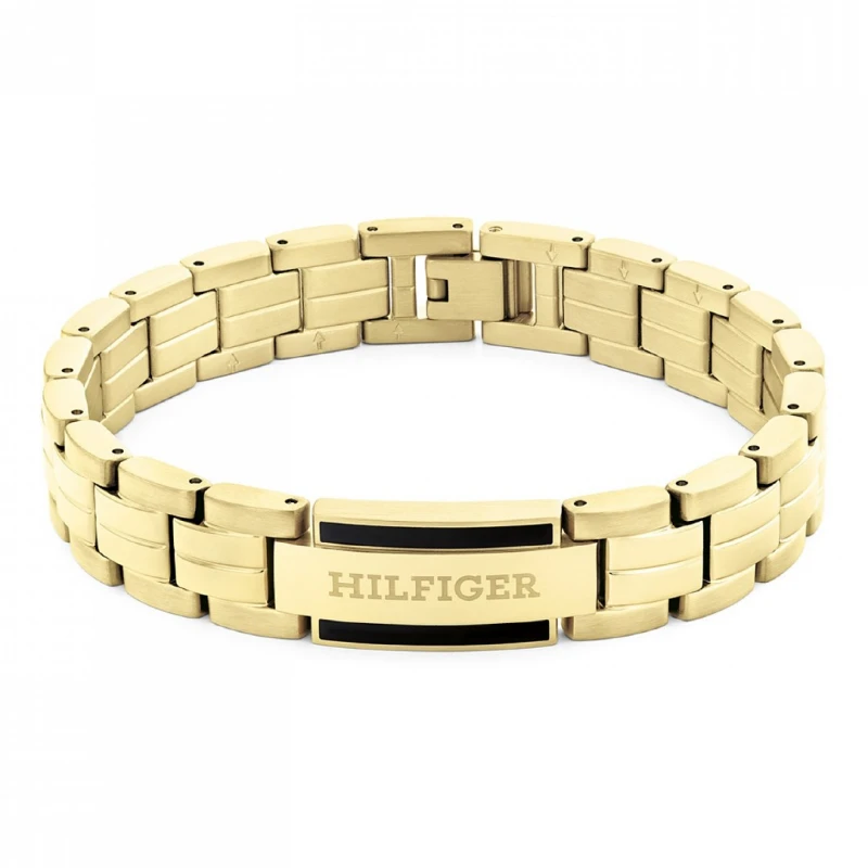 Pulseira Tommy Hilfiger em aço inoxidável com um elegante acabamento de um banho dourado para um toque refinado e luxuoso. Desenhado em elos, o fecho da joia destaca o nome da marca sobre uma faixa com a mesma paleta cromática, conferindo elegância e ousadia envolvente ao look dentro de um design simples.