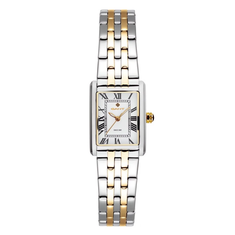 Um relógio feminino Gant, da elegante coleção Rhode Island, com bracelete e caixa em aço inoxidável. Um modelo bicolor em prateado e dourado, com um mostrador em formato retangular e numeração romana, que dá o toque de classe que falta ao seu look.