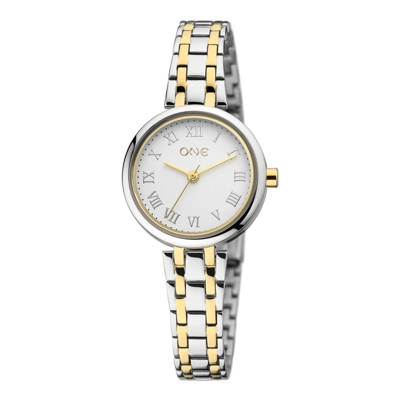Relógios de mulher One Sublime, um elegante modelo bicolorido em prateado e dourado num design minimalista com caixa circular de movimento em quartzo. Simples com um toque refinado, este acessório é a peça ideal para envolver o pulso feminino com subtileza para um look do quotidiano.