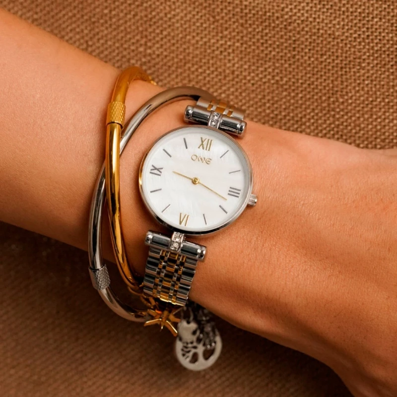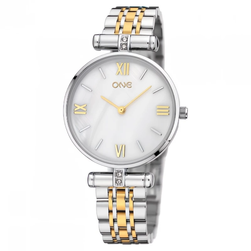 Relógio ONE Supreme de tom bicolor em prateado e dourado, com mostrador em madrepérola branca e numeração romana. Com uma bracelete de beleza impar, conta nos extremos com duas brilhantes zircónias para dar o toque de sofisticação que faltava a este belíssimo relógio feminino, o parceiro ideal do seu dia-a-dia.