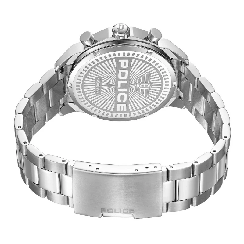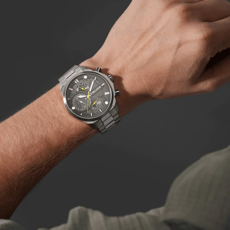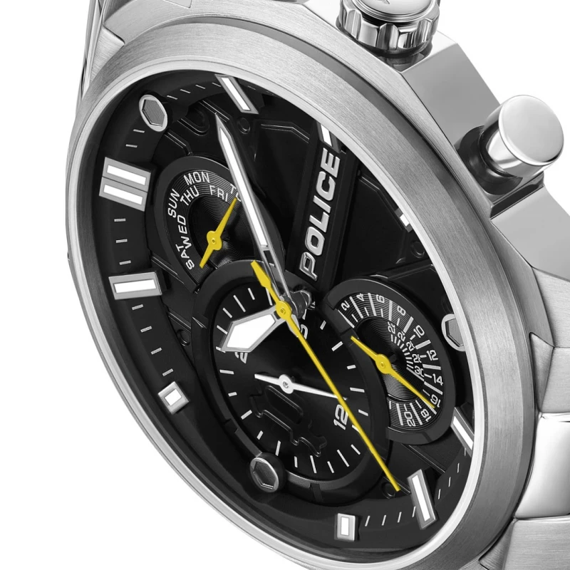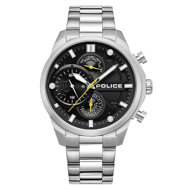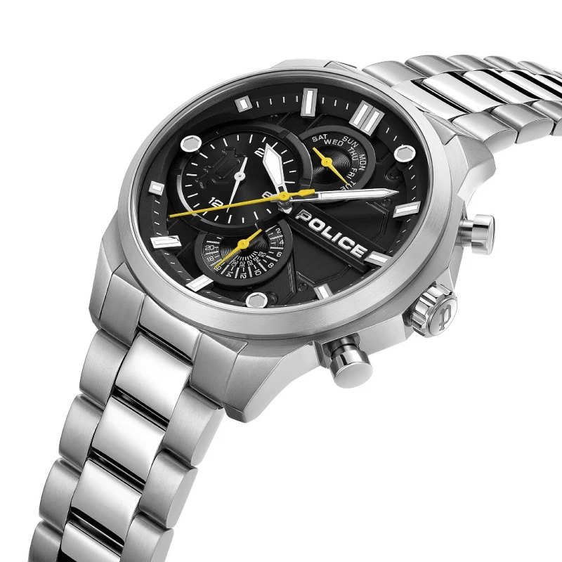 Complemente o seu guarda-roupa com este ousado relógio masculino Police, da linha Reactor, elaborado em aço prateado com uma caixa que envolve um mostrador negro detalhado de elementos intrigantes. Com um estilo cronógrafo com detalhes de ponteiros brancos e amarelos, este modelo oferece uma funcionalidade que atende às necessidades diárias para um homem que procura evocar um visual de espírito livre e forte.