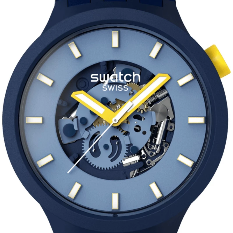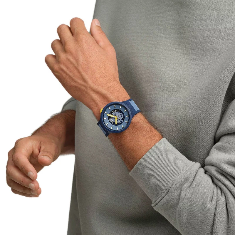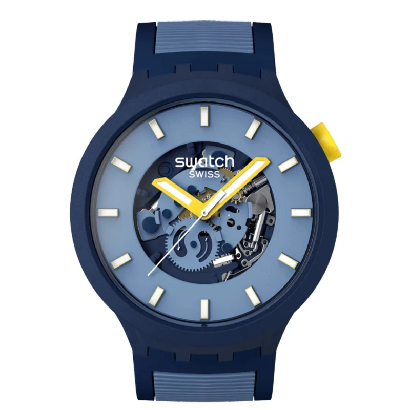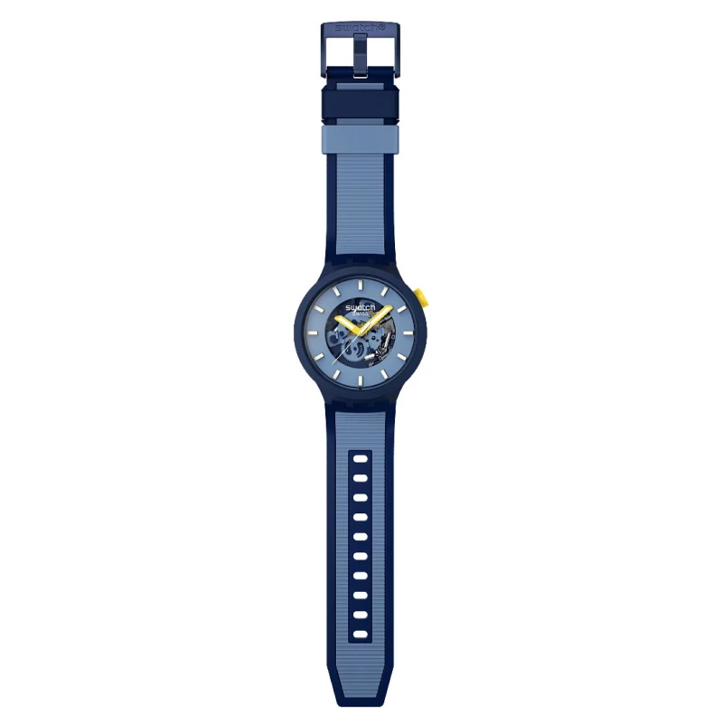 Expresse um look divertido e sofisticado com este relógio unissexo da Swatch, da linha Below the Horizon. Confecionado com materiais de origem biológica e silicone na bracelete, este modelo analógico apresenta um toque contrastante com as tonalidades de cores aplicadas, que variam nos azuis no mostrador, caixa e bracelete com o amarelo na coroa e nos ponteiros que proporcionam um efeito de brilho no escuro. Com um design de grandes dimensões, detalhado com a visibilidade da máquina no centro deste acessório, crie uma combinação de inovação e elegância para um visual distinto.