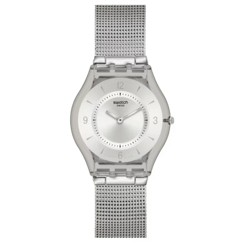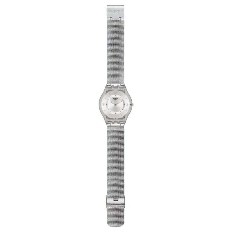 Conheça este novo relógio ultrafino da conceituada marca SWATCH, com uma bracelete milanesa ajustável em aço inoxidável, que combina com o mostrador prateado com efeito escovado. Vai combinar com os seus looks diários.