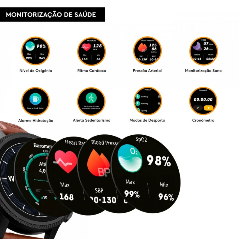 | Funções | Formato 12 Horas, Formato 24 Horas, Duplo Fuso Horário, Calendário, Alarme, Cronómetro, GPS, Monitorização de Saúde, Modos de Desporto, Localizador de Telemóvel, Notificação de Chamadas e Mensagens, Efetua e Recebe Chamadas, Assistente de Voz, Meteorologia, Controlo de Música, |