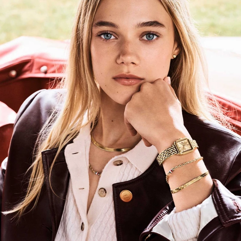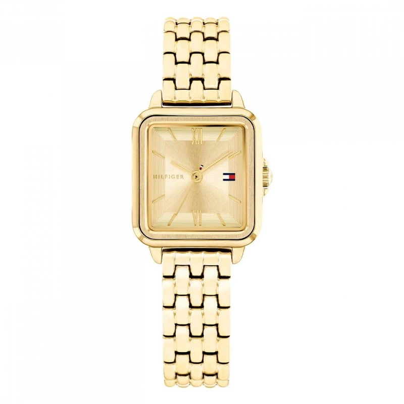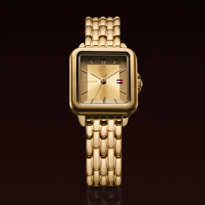 Relógio feminino da Tommy Hilfiger, um modelo elaborado em aço inoxidável com um banho dourado na bracelete e caixa quadrangular. De design moderno com um toque minimalista, este modelo comporta um mostrador com a mesma paleta cromática com um detalhe texturizado. Um acessório intemporal que se torna essencial para complementar o look de uma mulher para o dia-a-dia.