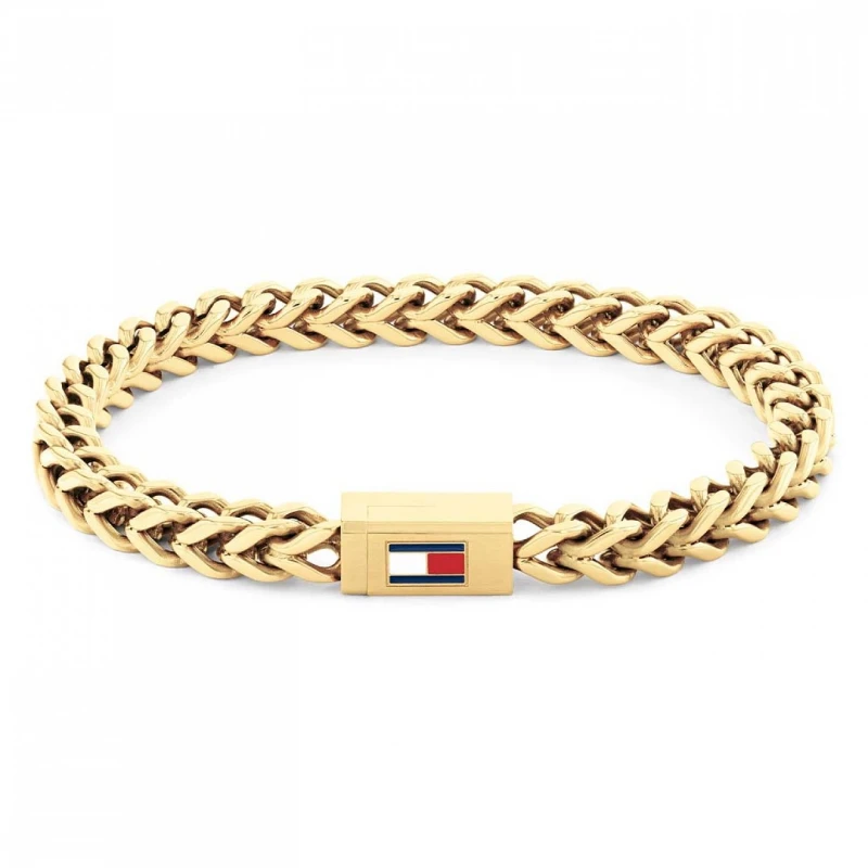 Pulseira Tommy Hilfiger dourada para homem em aço inoxidável. De visual sóbrio, esta peça desperta um visual singular com a sua malha robusta de elos entrelaçados e com um fecho retangular com o símbolo colorido da marca. Um design vanguardista que proporciona uma estética ao look de modelo elegante e confiante.
